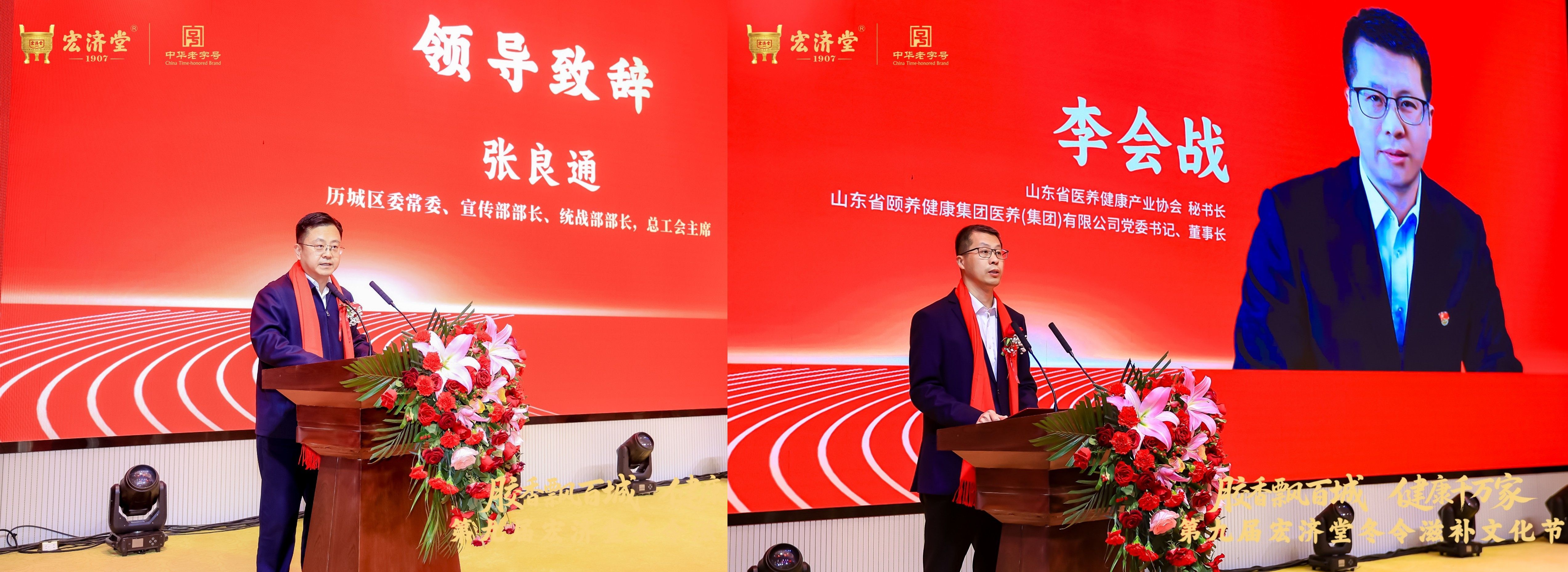 產(chǎn)業(yè)協(xié)同與文化賦能領(lǐng)域的成果同樣亮眼。開(kāi)幕式上,宏濟(jì)堂健康產(chǎn)業(yè)董事長(zhǎng)兼總裁劉皓發(fā)布“傳承國(guó)藥精華 科技賦能滋補(bǔ)”的大健康產(chǎn)品創(chuàng)新與合作藍(lán)圖;“智慧國(guó)藥 渠道共生——宏濟(jì)堂制藥&中盈醫(yī)藥集團(tuán)品牌共建項(xiàng)目”同步啟動(dòng),開(kāi)啟渠道協(xié)同、市場(chǎng)共拓的產(chǎn)業(yè)合作新路徑。壓軸環(huán)節(jié)中,中共濟(jì)南市委宣傳部副部長(zhǎng)王來(lái)勇,歷城區(qū)委常委、副區(qū)長(zhǎng)文海生,濟(jì)南市工業(yè)和信息化局黨組成員、副局長(zhǎng)王沖鶄,宏濟(jì)堂制藥香港集團(tuán)CEO 張衛(wèi)強(qiáng)共同為扁鵲醫(yī)坊揭牌,這一傳承扁鵲精神的文化載體正式亮相,不僅豐富了中醫(yī)藥文化傳播的載體,更助力“扁鵲故里 康養(yǎng)濟(jì)南”城市名片煥發(fā)新光彩,實(shí)現(xiàn)文化價(jià)值與城市發(fā)展的雙向賦能。最后,在省市區(qū)各級(jí)領(lǐng)導(dǎo)、合作伙伴及媒體朋友的共同見(jiàn)證下,第九屆宏濟(jì)堂冬令滋補(bǔ)文化節(jié)盛大啟幕。