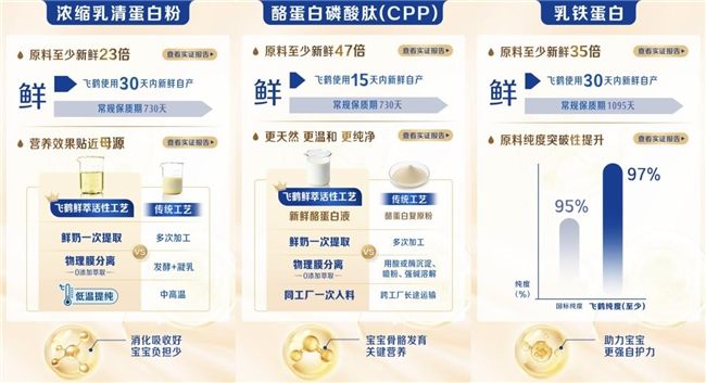 數(shù)據(jù)顯示,飛鶴自產(chǎn)乳清蛋白采用全球獨家納米級生物膜層析工藝,新鮮度達傳統(tǒng)原料的23倍;自產(chǎn)酪蛋白磷酸肽全程鮮萃零添加,新鮮度達傳統(tǒng)原料的47倍,實證吸收效果提升6.4倍。