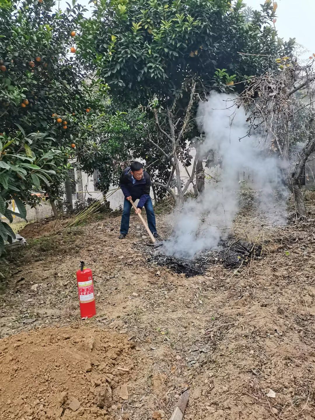到達(dá)目的地后,管理所負(fù)責(zé)人一邊叮囑王師傅“你先撤到安全區(qū)域,這里交給我們!”,一邊迅速分工。兩人手持滅火器對(duì)準(zhǔn)火源根部噴射,面對(duì)嗆人的濃煙和灼熱的火苗,兩人不顧個(gè)人安危,默契配合、沉著處置,先用滅火器壓制住明火勢(shì)頭,再逐一清理周邊易燃物,用泥土徹底覆蓋陰燃的柴火,防止復(fù)燃。經(jīng)過緊張?zhí)幹?,火情最終被成功控制,未造成人員傷亡,屋內(nèi)財(cái)產(chǎn)得以保全。