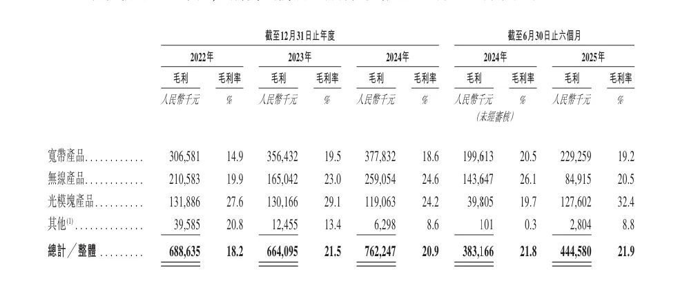 分產(chǎn)品來(lái)看,寬帶產(chǎn)品是該公司的主要收入來(lái)源,收入占比常年在54%至60%區(qū)間。另外,2025年上半年,公司光模塊產(chǎn)品的收入為3.94億元,占比提升至19.4%,而2024年的占比約13.5%。