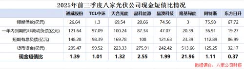2025年前三季度,在八家光伏龍頭中,除了東方日升現(xiàn)金短債比僅有0.37外,其他企業(yè)都在1以上,短期財(cái)務(wù)狀況較為安全。