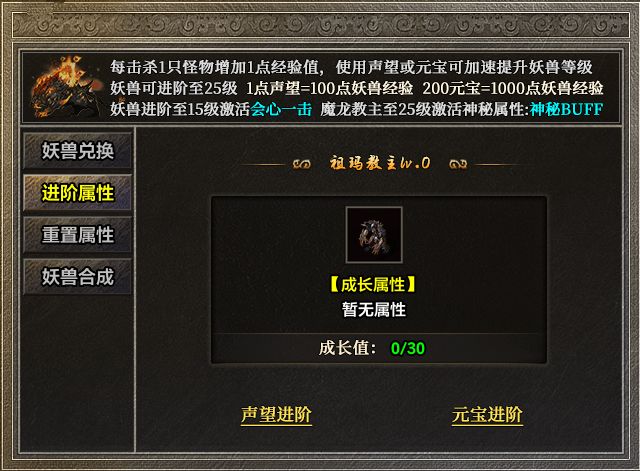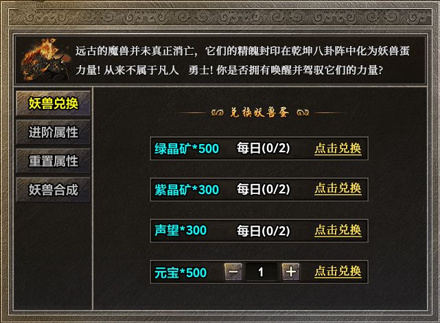 妖獸的成長路徑極為親民:每擊殺一只怪物,不論普通小怪還是終極BOSS,均為妖獸提供1點經(jīng)驗。你也可以通過聲望與元寶加速養(yǎng)成。獲取方式更是多樣——挑戰(zhàn)對應(yīng)BOSS直接掉落,或通過每日活動獲取的“妖獸蛋”進行抽取。集齊5只相同妖獸,更能合成更高品階,讓成長每一步都充滿策略與驚喜。
