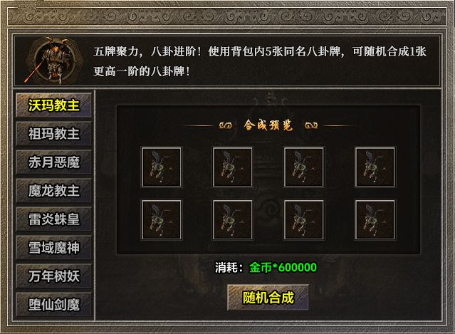 八卦牌主要通過挑戰(zhàn)指定BOSS必定掉落獲得(卦位隨機),從此打?qū)毮繕嗣鞔_,動力十足。多余的八卦牌無需擔(dān)心占據(jù)背包,可存入專屬倉庫,更可5張同卦位、同品質(zhì)合成更高一階的隨機八卦牌,讓每一份努力都不被浪費。