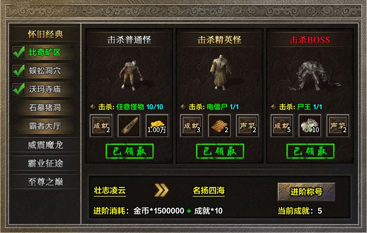 “屠魔稱號”玩法帶領(lǐng)玩家跟隨指引清圖挑戰(zhàn),即可獲得成就點數(shù)與豐厚獎勵。提升稱號不僅能增強屬性,更直接增加“對怪固傷與增傷”,是新地圖開荒的效率保證。