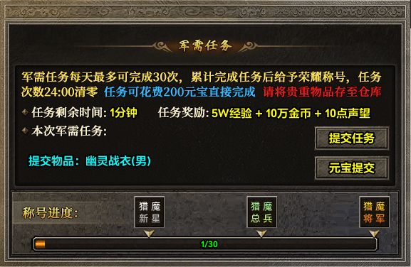 還有“百草淬體” 、“軍需任務(wù)”也是助力成長的有力階梯,前者通過消耗草藥概率提升屬性,達成“百煉圣體”稱號;后者每日完成30次即可榮獲“獵魔將軍”稱號,獎勵豐厚節(jié)奏自如,誠意滿滿犒勞玩家老鐵。