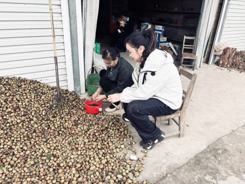 (圖為工作隊(duì)和農(nóng)戶一起剝油茶果現(xiàn)場(chǎng) 程奧)