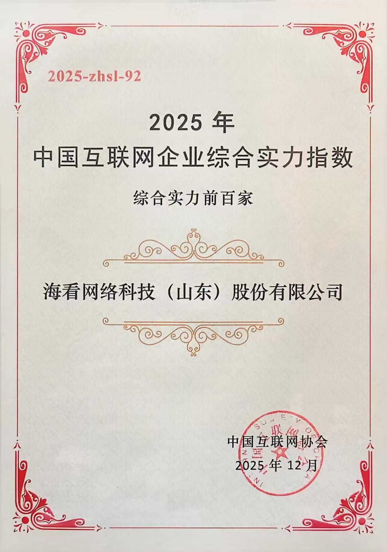 12月29日,中國互聯(lián)網(wǎng)協(xié)會主辦的中國互聯(lián)網(wǎng)企業(yè)綜合實力指數(shù)(2025)發(fā)布會在北京舉辦,大會揭曉了“2025年中國互聯(lián)網(wǎng)綜合實力前百家企業(yè)”,??淳W(wǎng)絡科技(山東)股份有限公司憑借卓越的綜合實力和廣泛的行業(yè)影響力第七次上榜,持續(xù)領跑互聯(lián)網(wǎng)視聽產(chǎn)業(yè),彰顯穩(wěn)健發(fā)展態(tài)勢與行業(yè)領先地位。