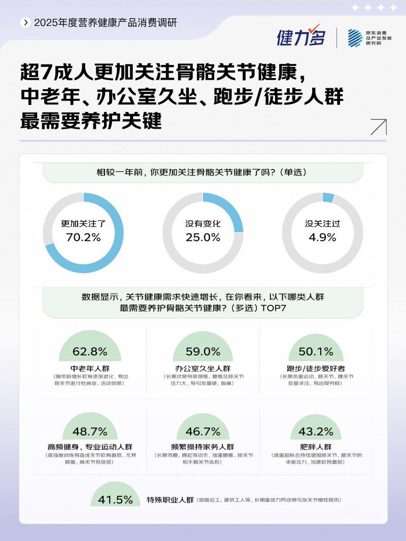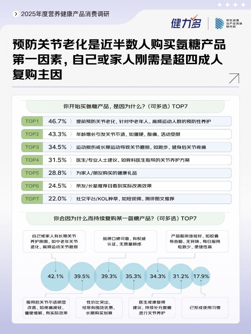 聯(lián)合洞察顯示,關(guān)節(jié)養(yǎng)護需求正從“中老年緩解”延伸至全年齡段“主動預(yù)防”,產(chǎn)品端也從“氨糖+軟骨素”的廣譜配方,轉(zhuǎn)向了“人群細分+場景定制+成分復(fù)配”的精準化升級方向。