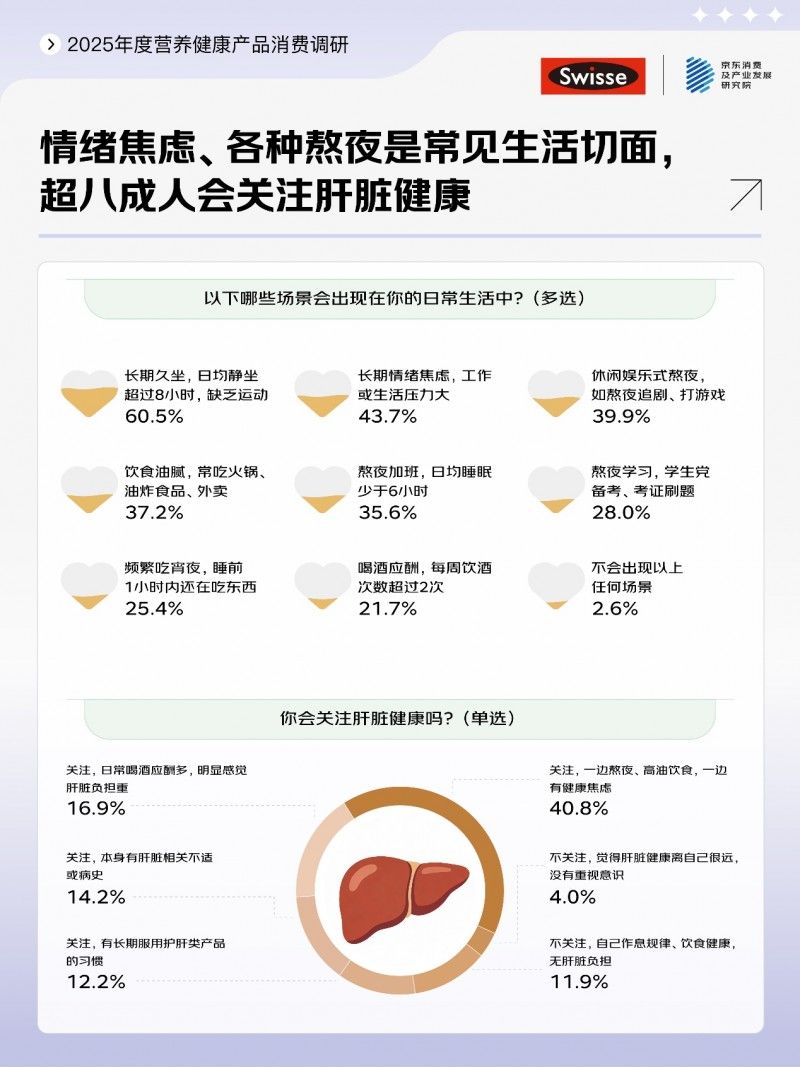 Swisse斯維詩指出,2025年除了傳統(tǒng)熬夜加班人群購買護肝片外,熬夜帶娃的奶爸奶媽們,為保持照料孩子的充足精力,也開始重視肝臟養(yǎng)護;除了商務(wù)應(yīng)酬較多的職場精英常備護肝片以外,喜愛小酌的消費者也會主動選擇護肝片。