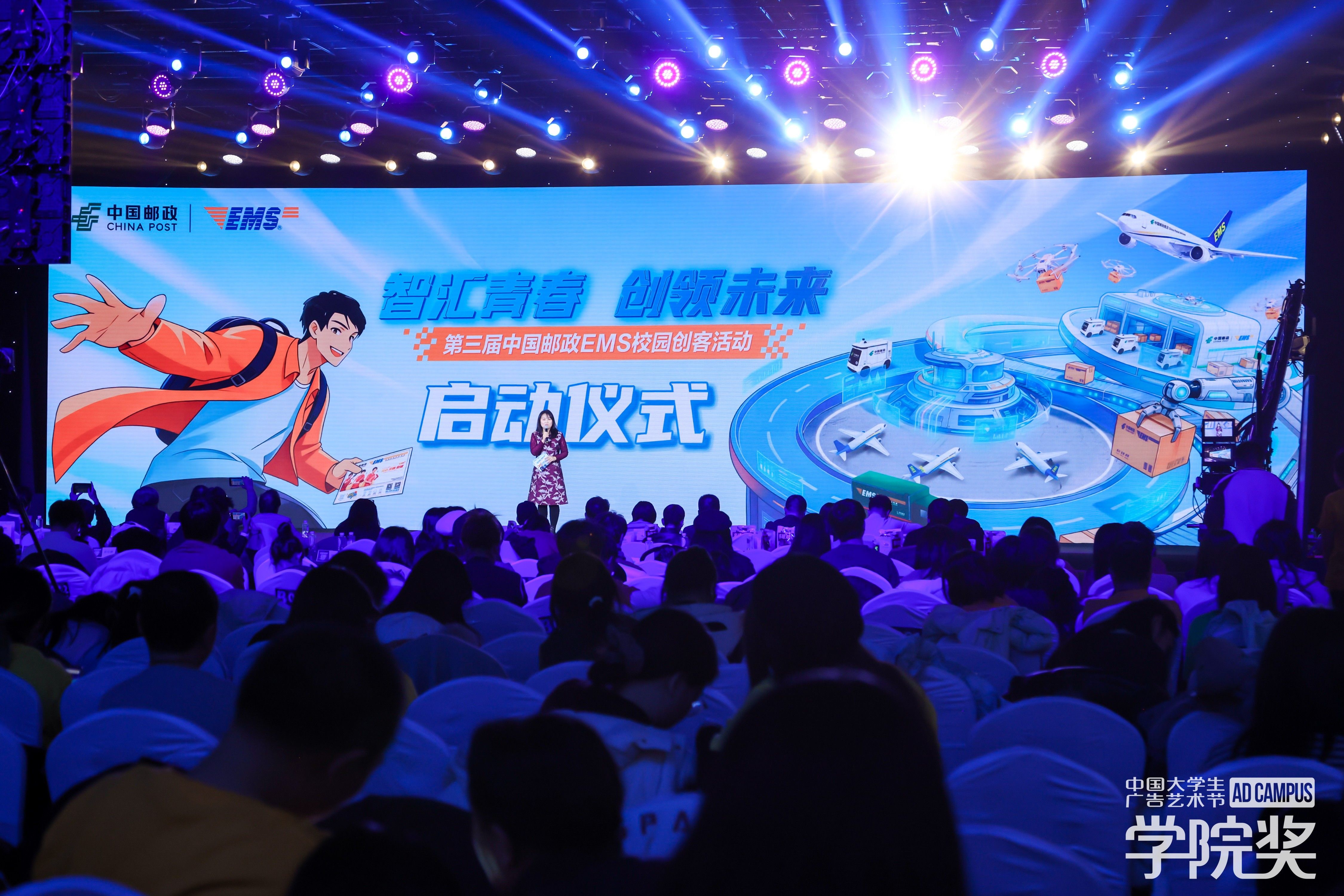 中國郵政速遞物流股份有限公司市場部副總經(jīng)理沈靜女士,學(xué)院獎評審主席、MATCH馬馬也創(chuàng)始人&CEO莫康孫先生,中國廣告協(xié)會副會長、廣告人文化集團董事長李文龍先生,學(xué)院獎監(jiān)審主席、中廣協(xié)廣告與品牌委員會副主任、魯花集團品牌顧問初志恒先生,中國郵政廣告?zhèn)髅焦緢D稿審核部負責(zé)人田芳女士共同登臺,在全場倒計時中點亮啟動大屏,標(biāo)志著第三屆中國郵政EMS校園創(chuàng)客活動正式面向全國高校啟航!