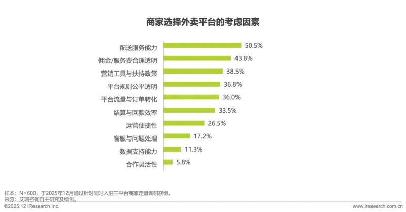 與此同時(shí),商家選擇平臺(tái)的核心邏輯也轉(zhuǎn)向價(jià)值維度,調(diào)研顯示,“配送服務(wù)能力”以50.5%超半數(shù)居于高位,其次是“傭金/服務(wù)費(fèi)合理透明”(43.8%)、“營(yíng)銷工具與扶持政策”(38.5%)。反映出行業(yè)正從成本導(dǎo)向邁向效率與價(jià)值導(dǎo)向。