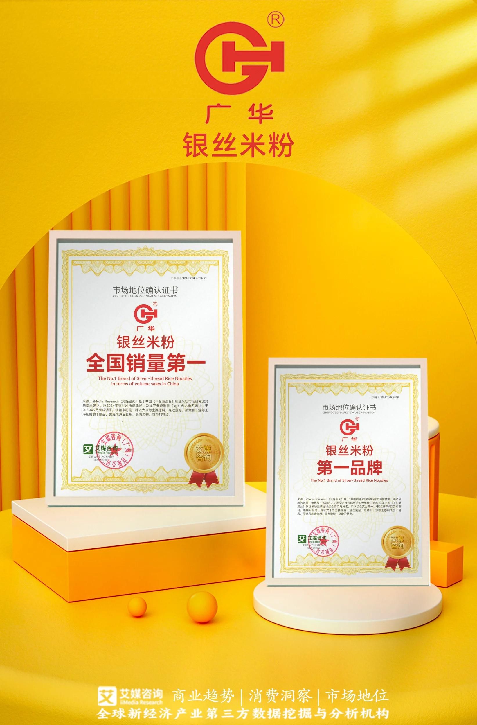 近期,廣華食品獲全球領(lǐng)先的新經(jīng)濟(jì)產(chǎn)業(yè)第三方數(shù)據(jù)挖掘和分析機(jī)構(gòu)iiMedia Research(艾媒咨詢)授予的“銀絲米粉全國銷量第一”“銀絲米粉第一品牌”雙項(xiàng)市場地位確認(rèn)。