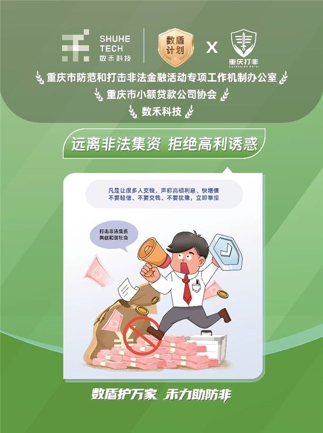 在重慶當(dāng)?shù)?,?shù)禾科技聯(lián)合重慶市防范和打擊非法金融活動(dòng)專項(xiàng)工作機(jī)制辦公室和重慶市小額貸款公司協(xié)會(huì),進(jìn)一步擴(kuò)容金融風(fēng)險(xiǎn)科普維度,在覆蓋同類騙局基礎(chǔ)上,新增 “遠(yuǎn)離非法集資 拒絕高利誘惑” 主題,海報(bào)直擊“高額利息、快速增值”等常見(jiàn)誘餌,提醒居民“天上不會(huì)掉餡餅”。