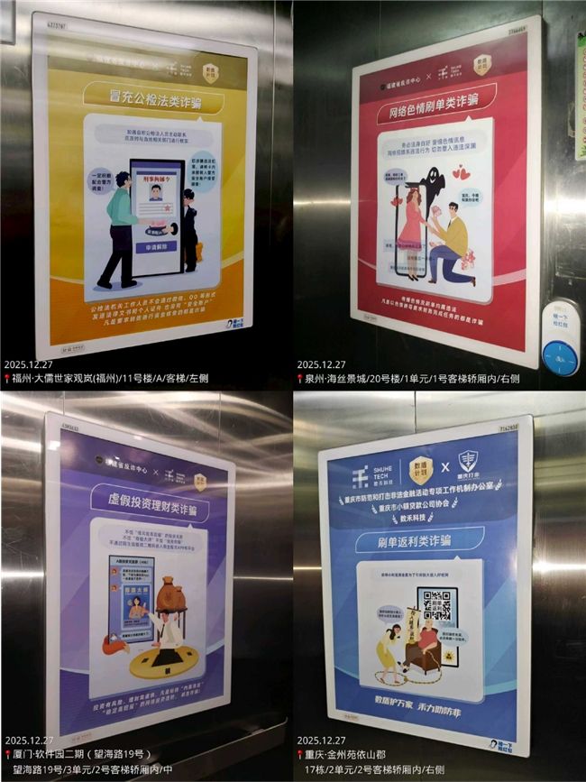 本次上線的分眾電梯媒體,廣泛分布于福州、泉州、廈門(mén)及重慶等多地的小區(qū)、寫(xiě)字樓等場(chǎng)所,精準(zhǔn)輻射不同年齡段、不同職業(yè)的居民群體——無(wú)論是上下班通勤的上班族、采購(gòu)出行的家庭主婦,還是接送孩童的老年群體,都能在日常出行中自然接觸到反詐海報(bào)。這種“嵌入生活場(chǎng)景”的宣傳方式,避免了傳統(tǒng)宣傳“廣撒網(wǎng)”的低效率問(wèn)題,讓反詐知識(shí)精準(zhǔn)觸達(dá)每一個(gè)可能遭遇詐騙風(fēng)險(xiǎn)的家庭,尤其針對(duì)老年群體、新市民等易受騙人群形成重點(diǎn)覆蓋,有效彌補(bǔ)了以往宣傳的盲區(qū)與短板。