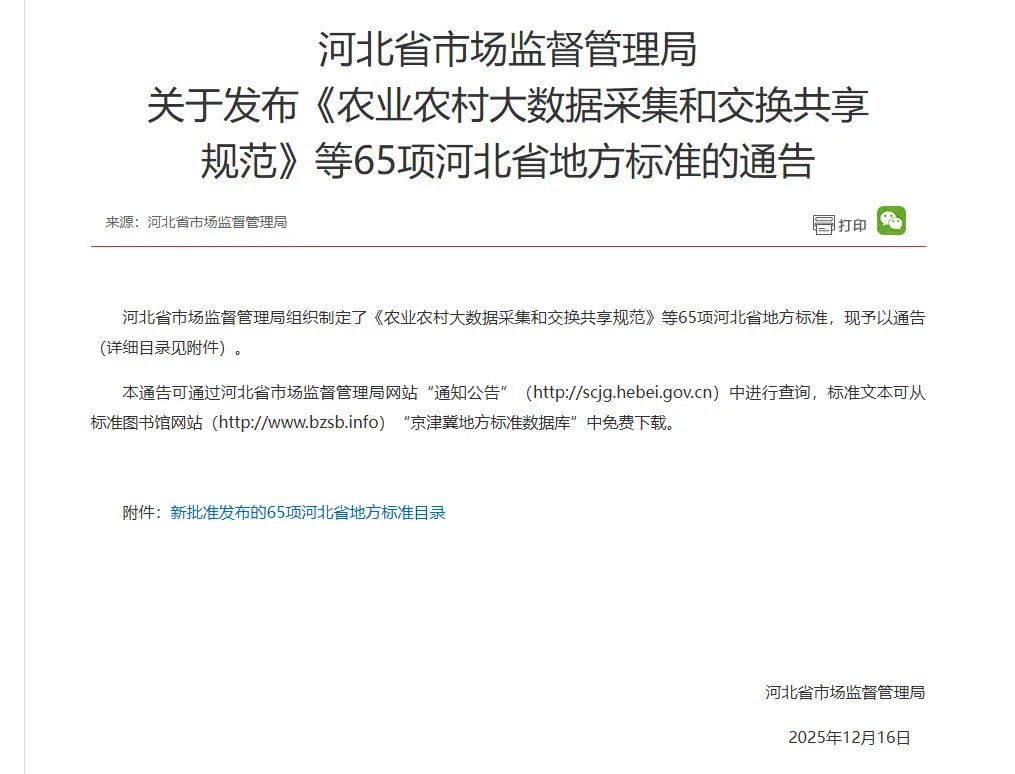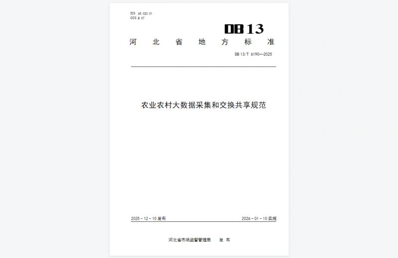 近日,河北省市場監(jiān)督管理局正式發(fā)布2025年第24號通告,由世窗信息聯(lián)合河北省農(nóng)業(yè)信息中心、河北農(nóng)業(yè)大學(xué)共同編制的《農(nóng)業(yè)農(nóng)村大數(shù)據(jù)采集和交換共享規(guī)范》(DB13/T6190-2025)成功獲批省級地方標(biāo)準(zhǔn),將于2026年1月16日正式實(shí)施。這一標(biāo)準(zhǔn)的落地,不僅填補(bǔ)了河北省農(nóng)業(yè)農(nóng)村大數(shù)據(jù)領(lǐng)域的標(biāo)準(zhǔn)空白,更標(biāo)志著我省農(nóng)業(yè)農(nóng)村大數(shù)據(jù)建設(shè)告別"數(shù)據(jù)孤島"時(shí)代,邁入標(biāo)準(zhǔn)化、規(guī)范化、集約化發(fā)展的全新階段,為全國農(nóng)業(yè)數(shù)字化轉(zhuǎn)型提供了可復(fù)制、可推廣的"河北樣本"。
