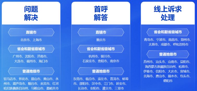 根據(jù)單項指標表現(xiàn)情況,北京市、上海市、廣州市、沈陽市、駐馬店市等城市在問題解決方面表現(xiàn)突出;重慶市、杭州市、銀川市、東莞市等城市在首呼解答方面表現(xiàn)突出;青島市、寧波市、蘇州市、汕頭市、山南市等城市在線上訴求處理方面表現(xiàn)突出。