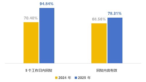 從訴求受理回復(fù)質(zhì)效來看,94.84%的城市能夠在5個工作日內(nèi)對線上端提交訴求進行回復(fù)(同比增長24.44個百分點),78.31%的回復(fù)內(nèi)容給到了明確具體的答案(同比增長9.75個百分點)。