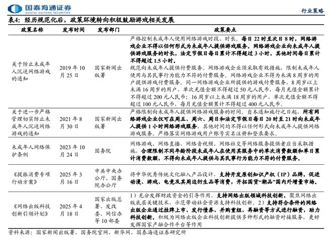 游戲政策方向積極,行業(yè)估值有望持續(xù)修復(fù)。2023 年之前游戲行業(yè)所面臨的政策主要圍繞未成年人防沉迷等方面,以規(guī)范化為主。經(jīng)歷多年調(diào)整后,政策端開始向積極鼓勵(lì)過渡,如 2025 年《提振消費(fèi)專項(xiàng)行動(dòng)方案》《網(wǎng)絡(luò)出版科技創(chuàng)新引領(lǐng)計(jì)劃》開始鼓勵(lì)游戲消費(fèi)與創(chuàng)新。隨后多個(gè)地方也推出當(dāng)?shù)氐挠螒蚬膭?lì)政策。