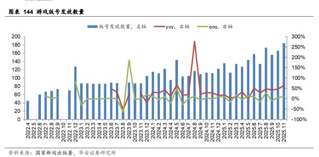 游戲版號(hào)發(fā)放力度提升,保障行業(yè)供給端擴(kuò)容。版號(hào)發(fā)放數(shù)量自 2022 年觸底以來穩(wěn)步回升,2025年 1-11 月國產(chǎn)游戲發(fā)放版號(hào)數(shù)為 1532 個(gè),同比增長 29%。需求側(cè),游戲作為情緒消費(fèi)的重要賽道,市場規(guī)模持續(xù)擴(kuò)容,2025 年中國游戲市場累計(jì)收入約 3508 億元,同比增長 8%。