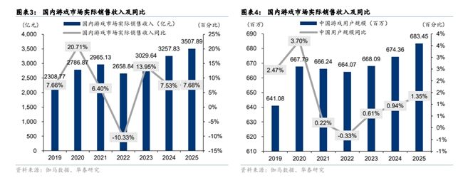 2025年,中國游戲行業(yè)需求顯著回暖,國內(nèi)游戲市場實(shí)際銷售收入與用戶規(guī)模雙雙創(chuàng)下歷史新高。驅(qū)動(dòng)因素包括版號(hào)審批常態(tài)化帶來的穩(wěn)定供給、小程序游戲等多端互通模式有效擴(kuò)張玩家基數(shù),以及AI技術(shù)深度融合帶來的體驗(yàn)革新。同時(shí),自研游戲海外銷售收入持續(xù)增長,顯示出強(qiáng)大的增長韌性。行業(yè)正從規(guī)模增長轉(zhuǎn)向以技術(shù)驅(qū)動(dòng)和文化賦能的高質(zhì)量發(fā)展。根據(jù)游戲工委,2025 年國內(nèi)游戲市場實(shí)際銷售收入預(yù)計(jì)達(dá)3507.89 億元,同比增長 7.68%;用戶規(guī)模突破 6.83 億,同比增長 1.35%,游戲市場規(guī)模增長主要受益于用戶 ARPU 提升。其中,移動(dòng)游戲?qū)嶄N收入預(yù)計(jì)達(dá) 2570.76 億元,同比增長7.92%;客戶端游戲強(qiáng)勢(shì)回升,實(shí)銷收入預(yù)計(jì)達(dá) 781.6 億元,同比大幅增長 14.97%,占比提升至 22.28%,主要受益于頭部長青產(chǎn)品穩(wěn)定貢獻(xiàn)與多端互通發(fā)行策略。