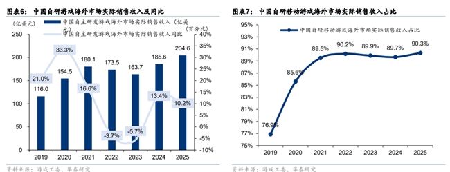 游戲出海是景氣上行的方向。根據(jù)游戲工委數(shù)據(jù),2025 年自研游戲海外市場實(shí)際銷售收入預(yù)計(jì)達(dá) 204.55 億美元,同比增長 10.23%,其中自研移動(dòng)游戲海外收入預(yù)計(jì)達(dá) 184.78 億美元,同比增長13.16%,增速高于整體出海水平。2025 年預(yù)計(jì)策略類(含 SLG)游戲在海外收入前 100 的自研移動(dòng)游戲中占比 49.96%,同比顯著上升,統(tǒng)治地位持續(xù)強(qiáng)化;射擊類與角色扮演類游戲分別占比 9.69%和 9.39%,形成多元化品類支撐。