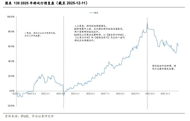 2025 年,游戲行業(yè)煥發(fā)新生,前三季度游戲公司收入流水表現(xiàn)亮眼。收入端各主要廠商均有代表產(chǎn)品拉動(dòng)業(yè)績?cè)鲩L,例如騰訊的《三角洲行動(dòng)》、網(wǎng)易的《第五人格》和《永劫無間》、巨人網(wǎng)絡(luò)的《超自然行動(dòng)組》、吉比特的《仗劍傳說》等。利潤側(cè),游戲板塊費(fèi)用管控效果顯著,新游上線并未大幅拉動(dòng)銷售費(fèi)用的增長。2025Q1 游戲行業(yè)處于預(yù)熱階段,流水上并未起量。Q2 新游集中上線,流水增長同時(shí)板塊估值較低,兩個(gè)因素帶動(dòng)板塊拉升。Q3 游戲公司高效運(yùn)營新游,以《超自然行動(dòng)組》、《三角洲行動(dòng)》和《英雄沒有閃》為主的一系列高質(zhì)量游戲流水持續(xù)拉升。9 月中下旬游戲板塊開始回調(diào),游戲行業(yè)整體穩(wěn)定運(yùn)營。
