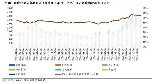 頭部公司權(quán)重提升顯著,關(guān)注頭部公司的估值水平。從市值體量來看,游戲行業(yè)頭部公司世紀(jì)華通、巨人網(wǎng)絡(luò)、愷英網(wǎng)絡(luò)、三七互娛、吉比特、完美世界、神州泰岳 7 家公司合計(jì)市值占整體游戲行業(yè)總市值比例在今年顯著提升,從過去的 50%上下提升到最高達(dá) 67%,近期有所回落仍保持 65%上下,頭部公司對(duì)行業(yè)影響權(quán)重突出。