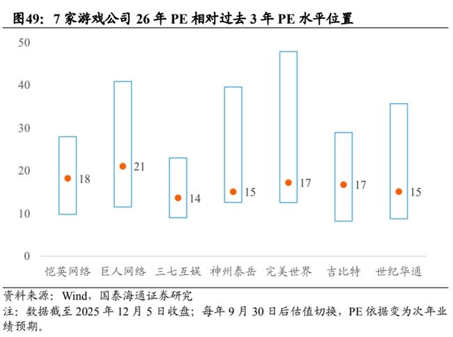 頭部公司當(dāng)前 26 年 PE 處于歷史合理分位。截至 2025 年 12 月 5 日收盤,頭部公司 PE 大多在 26 年業(yè)績的 14x 到 21x 之間,相對(duì)過去 3 年的 PE 范圍來看,當(dāng)前位置處于歷史合理分位水平。