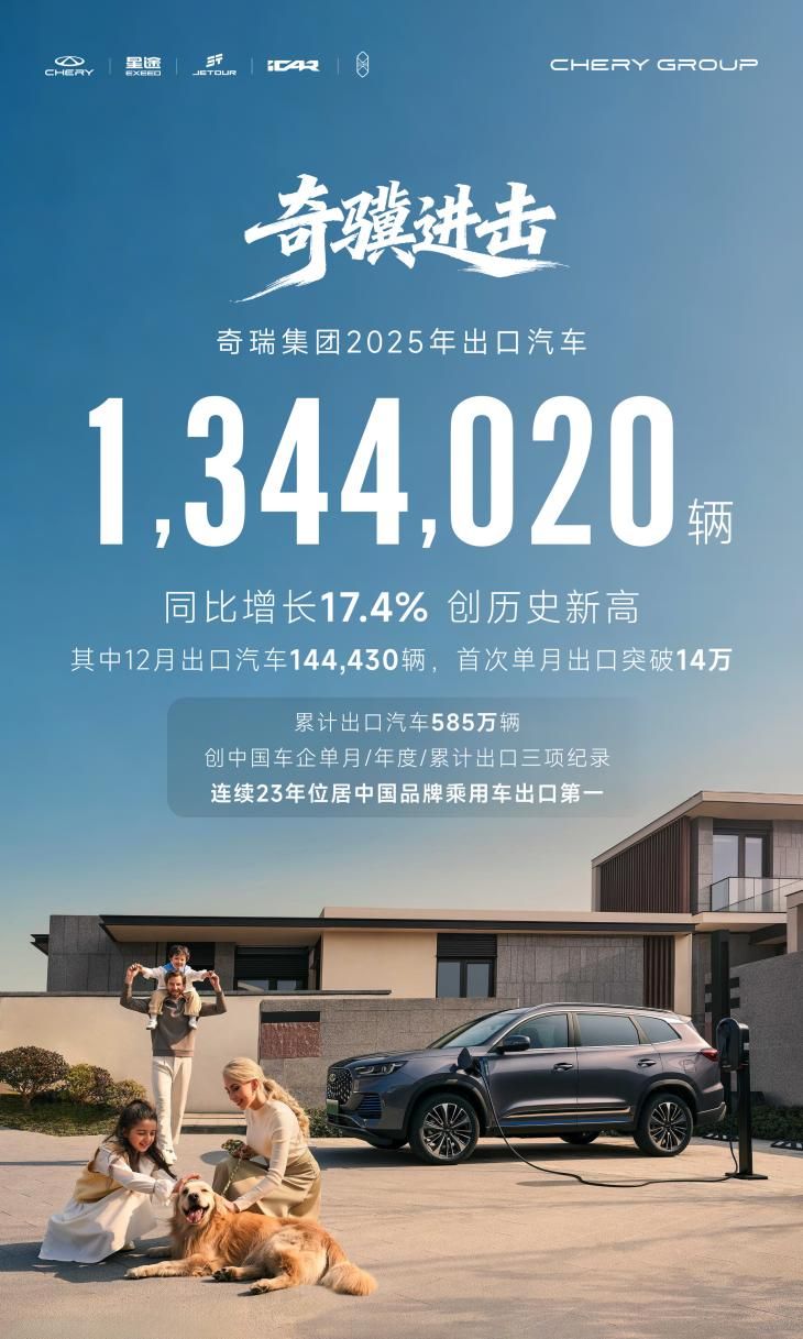 出口領(lǐng)域,奇瑞創(chuàng)下三項中國車企紀(jì)錄:12月單月出口144430 輛,同比增長46.8%,首次突破14萬輛;全年出口1344020輛,同比增長17.4%;累計出口達585萬輛,平均每23秒就有一輛奇瑞汽車揚帆海外。憑借強勁表現(xiàn),奇瑞連續(xù)23年位居中國品牌乘用車出口第一,成功進入英國、西班牙等15個歐洲市場,成為中國汽車出海標(biāo)桿。