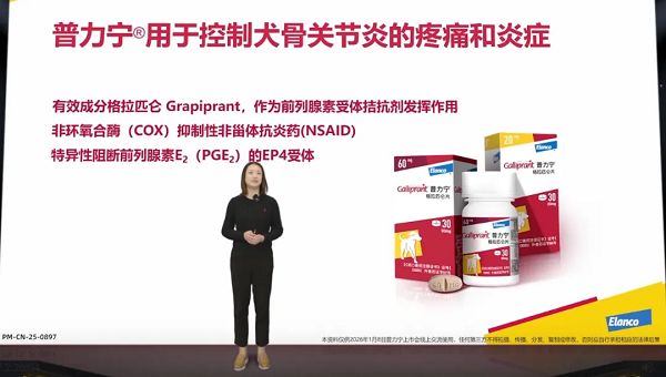 禮藍寵物健康事業(yè)部產(chǎn)品部門負責人應(yīng)悅佳,深度介紹了新品普力寧?(Galliprant?,格拉匹侖片)的相關(guān)信息。普力寧?的主要成分是格拉匹侖,是一種非環(huán)氧合酶(COX)抑制性非甾體類抗炎藥(NSAID),是前列腺素E2(PGE2)EP4受體拮抗劑。EP4受體是負責調(diào)節(jié)PGE2引發(fā)炎癥及疼痛的關(guān)鍵受體,是引起傷害感受的主要介質(zhì)。格拉匹侖通過與PGE2的EP4受體結(jié)合,從而達到抗炎和鎮(zhèn)痛的效果1。國外真實證據(jù)展示其良好的療效與安全性,自2016年Galliprant?在境外上市以來,10年累計惠及了全球千萬只患犬2。普力寧?在中國上市,是犬骨關(guān)節(jié)炎長期管理邁出的關(guān)鍵一步。