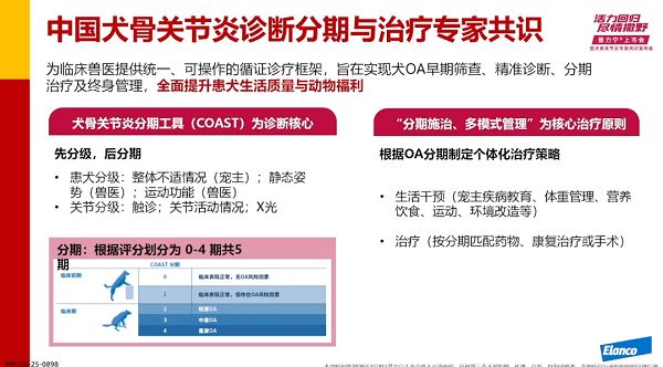 接下來,中國農(nóng)業(yè)大學動物醫(yī)院手術(shù)中心主任石磊,帶來犬骨關(guān)節(jié)炎專家共識介紹和診療經(jīng)驗分享,指出共識為臨床獸醫(yī)提供統(tǒng)一、可操作的循證診療框架,旨在實現(xiàn)犬骨關(guān)節(jié)炎早期篩查、精準診斷、分期治療及終身管理,全面提升患犬生活質(zhì)量與動物福利。診斷以COAST為準則,遵循“先分級、后分期”。治療上確立“分期施治、多模式管理”原則。COAST將犬骨關(guān)節(jié)炎劃分為5個連續(xù)且明確的臨床階段,覆蓋從風險期到終末期的全疾病譜。早期篩查治療有效減輕癥狀,助力患犬維持日常活動。