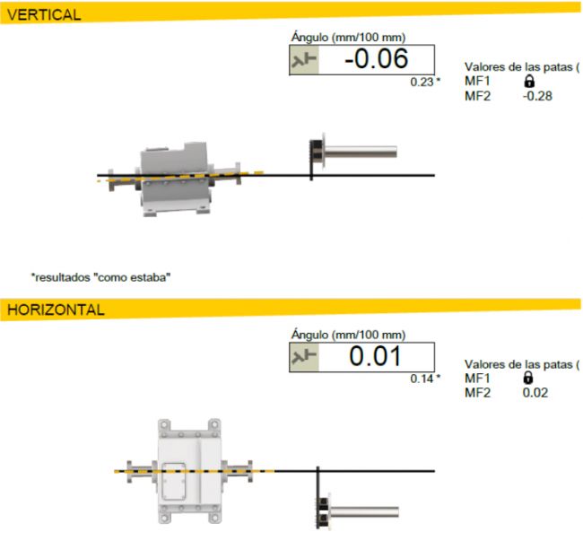 ● 垂直方向:角度調(diào)整至 - 0.06 mm/100mm,最終墊片值 MF1:0.00 mm、MF2:-0.28 mm;