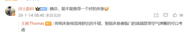 作為深諳產(chǎn)品之道的科技老兵,王騰顯然對(duì)aise寶褓情有獨(dú)鐘。他在分享中直言,自己曾走訪多家家居市場對(duì)比,在軟硬度調(diào)節(jié)技術(shù)上,喜臨門的表現(xiàn)明顯領(lǐng)先其他品牌。面對(duì)網(wǎng)友“腰椎不好該選什么床墊”的提問,他也給出實(shí)在建議:“傳統(tǒng)床墊選舒達(dá),智能床墊可考慮喜臨門高端款帶空氣彈簧的。”
