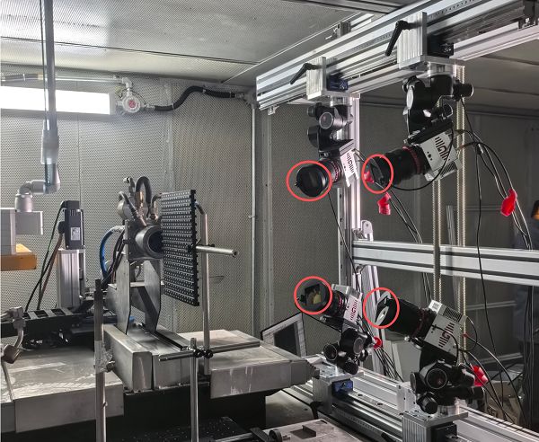 隨后完成四臺(tái)千眼狼PIV跨幀相機(jī)的空間布置(圖4),采用多視角跨幀成像方案,使各相機(jī)視場(chǎng)在測(cè)量體積內(nèi)形成充分重疊,從幾何布局層面保證體速度反演所需的視差信息,同時(shí)兼顧空間分辨率與成像穩(wěn)定性。
