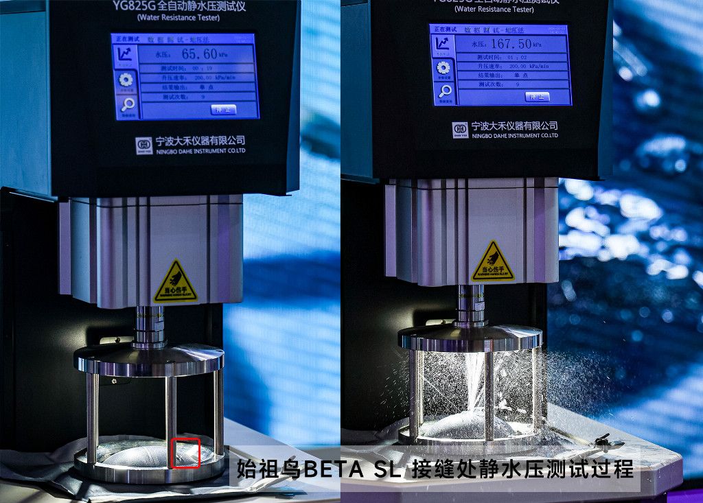 始祖鳥(niǎo)BETA SL接縫處?kù)o水壓測(cè)試中,水壓在65.60kPa左右出現(xiàn)小水珠,76kPa左右面料部分出現(xiàn)水柱漏水,最終在167.50kPa膠條接縫處漏水