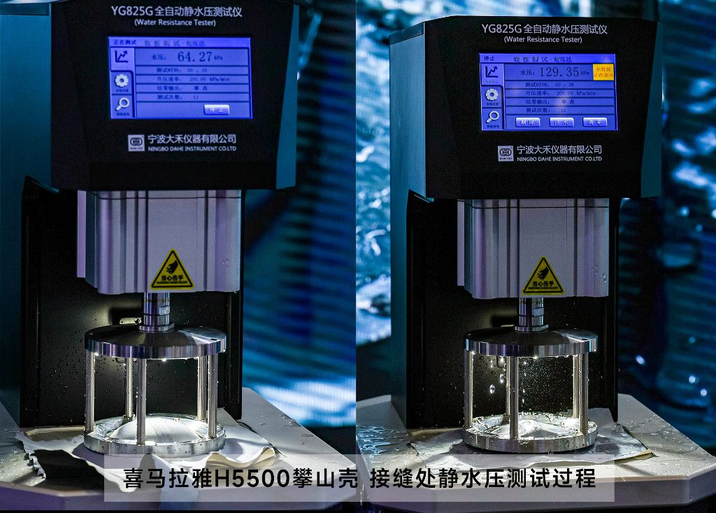 喜馬拉雅H5500攀山殼多點(diǎn)位測(cè)試中更穩(wěn)定,面料、膠條接縫處均未出現(xiàn)漏水,寧波大禾YG825G水壓測(cè)試儀顯示壓力值最終穩(wěn)定在129.35kPa