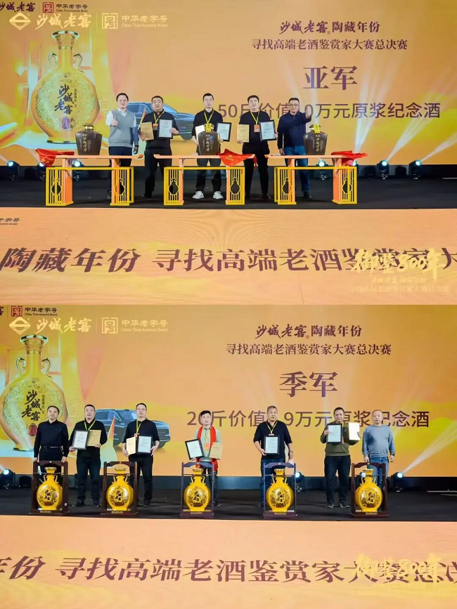 隨后,晚宴的頒獎環(huán)節(jié)將氣氛推向高潮,5名季軍、3名亞軍與總冠軍依次登臺受獎。他們的榮譽與沙城老窖萬噸地下酒庫中珍藏的老酒一脈相承,每一壇都源自歲月的積淀。獲獎?wù)咴诜鈼l上簽名,以此見證一份跨越時間的承諾。