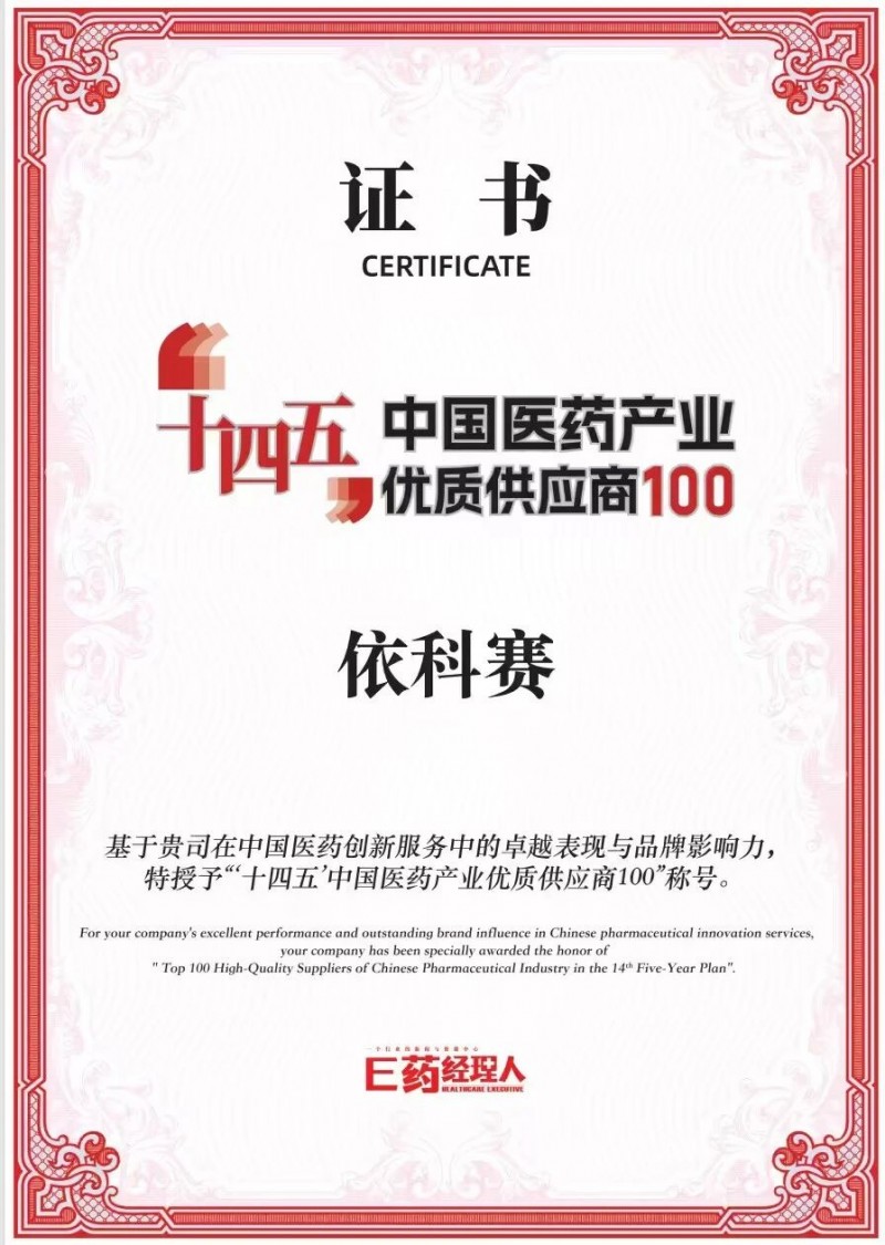 依科賽生物的入選,彰顯了我司在中國醫(yī)藥創(chuàng)新服務(wù)中的卓越表現(xiàn)與品牌影響力。