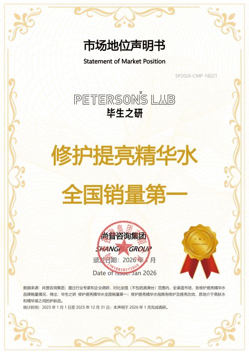 2026年1月,尚普咨詢集團(tuán)向畢生之研頒發(fā)市場(chǎng)地位聲明書。畢生之研榮獲【畢生之研修護(hù)提亮精華水全國(guó)銷量第一】市場(chǎng)地位聲明,標(biāo)志著其在護(hù)膚行業(yè)的標(biāo)桿地位及消費(fèi)者的高度認(rèn)可與信賴。