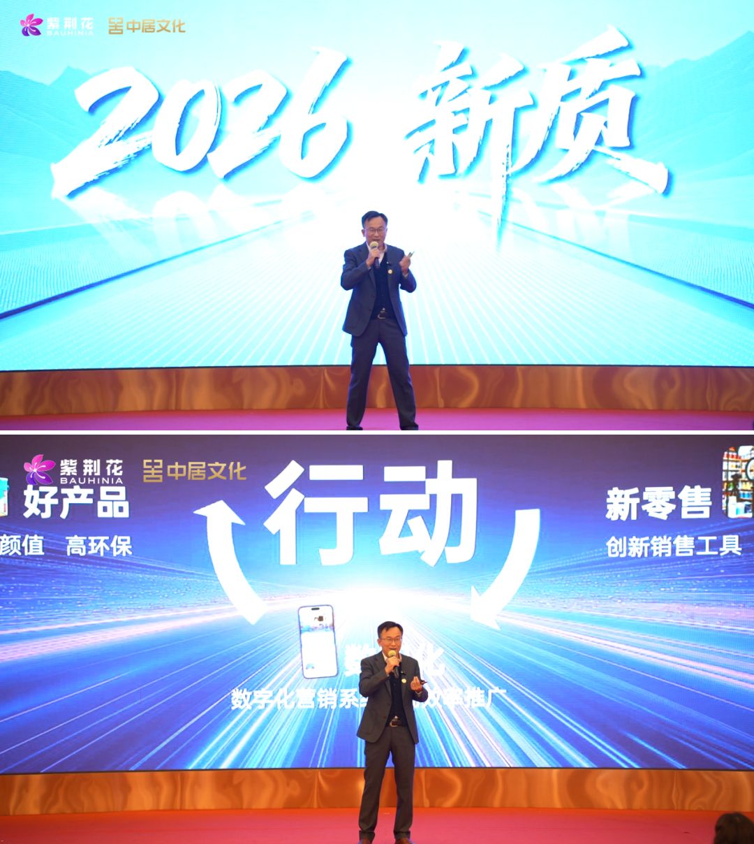 陳總明確,2026年紫荊花將通過三大核心戰(zhàn)略實現(xiàn)破局發(fā)展:- 好產(chǎn)品:堅守高品質、高顏值、高環(huán)保的核心標準,滿足消費者多元化家居需求;- 新零售:創(chuàng)新銷售工具,打通線上線下壁壘,實現(xiàn)全域渠道協(xié)同;- 數(shù)智化:搭建數(shù)字化營銷系統(tǒng),提升推廣效率,賦能全產(chǎn)業(yè)鏈條。“市場不論先后,有為方能有位”,紫荊花將攜手行業(yè)內(nèi)外優(yōu)秀專業(yè)機構,全面助力經(jīng)銷商伙伴擁抱新零售,共同跨越新未來。