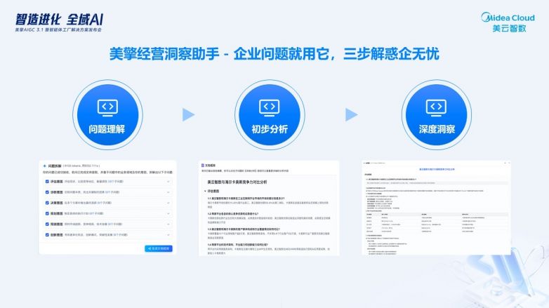 美擎經(jīng)營(yíng)洞察助手:用“數(shù)據(jù)看板+知識(shí)圖譜”拆解經(jīng)營(yíng)問(wèn)題,3步生成可落地的提效建議(如“庫(kù)存周轉(zhuǎn)率提升15%”)。