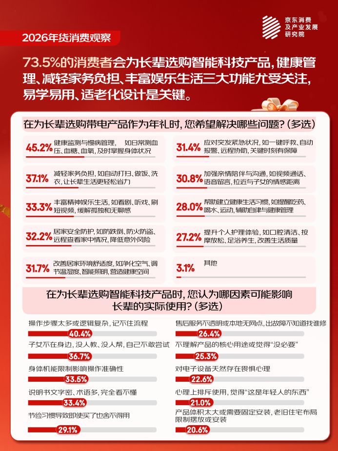 73.5%的消費者關(guān)注為長輩挑選更智能、更便捷的帶電產(chǎn)品作為年禮,這些產(chǎn)品被賦予遠(yuǎn)程陪伴、健康管家、生活助手等溫暖的角色,其中,健康監(jiān)測與慢病管理(45.2%)、減輕家務(wù)負(fù)擔(dān)(37.1%)以及豐富精神娛樂生活(33.3%)等功能尤為受關(guān)注。