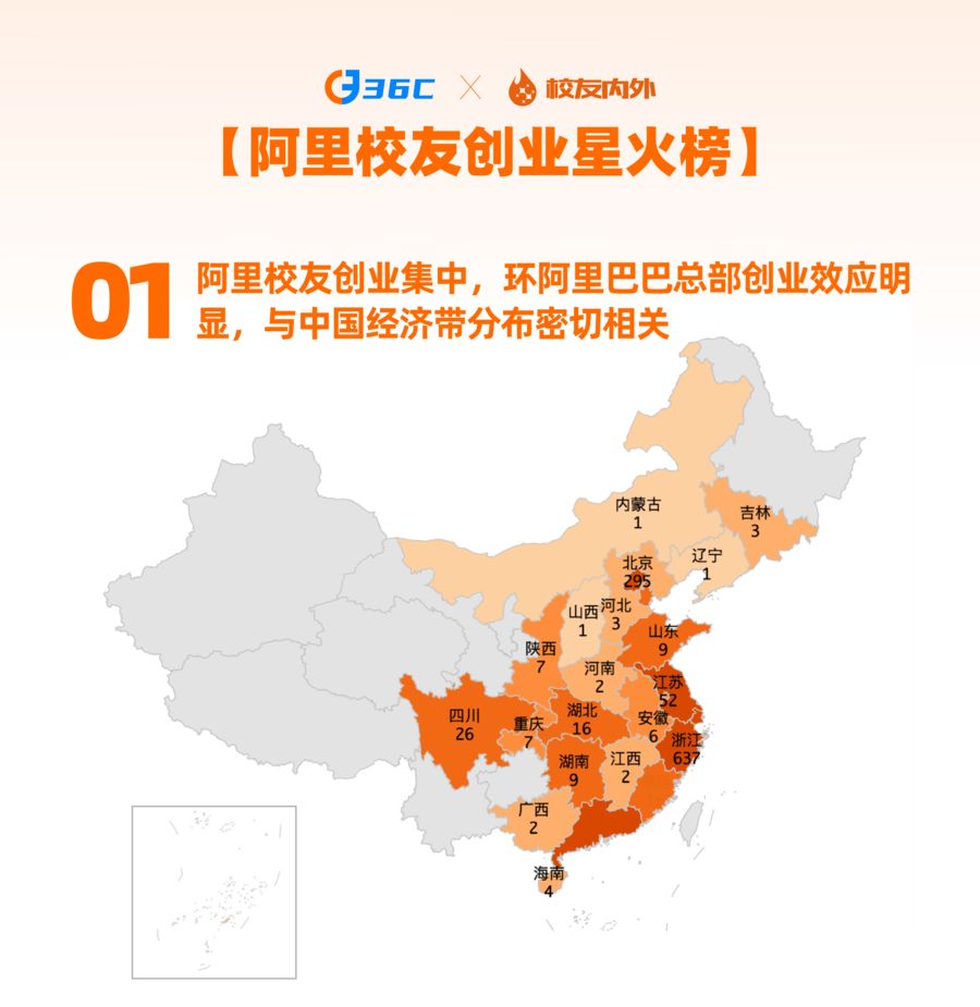 透過數(shù)據(jù)可見,在地域分布上,環(huán)總部創(chuàng)業(yè)輻射效應(yīng)突出,杭州是阿里巴巴總部所在地,有著完善的產(chǎn)業(yè)配套與創(chuàng)業(yè)氛圍,成為阿里校友創(chuàng)業(yè)的首選地,與北京、上海、深圳構(gòu)成四大聚集區(qū),與產(chǎn)業(yè)帶形成協(xié)同發(fā)展態(tài)勢(shì)。