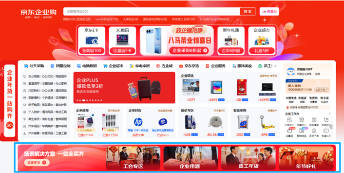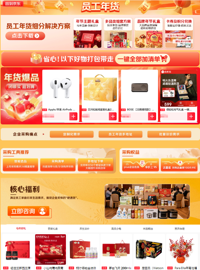 在政策引導(dǎo)與市場需求雙重驅(qū)動下,企業(yè)福利采購、年貨禮贈等需求集中釋放,京東企業(yè)購針對員工福利、商務(wù)禮贈等高頻場景,打造了年貨節(jié)場景解決方案,將京東平臺的標(biāo)準(zhǔn)化產(chǎn)品能力,轉(zhuǎn)化為“省心、高效、有溫度”場景化服務(wù),匯聚成“年貨節(jié)采購工具包”,顯著降低企業(yè)數(shù)字化采購門檻,實現(xiàn)從單純“賣商品”到深度“賣服務(wù)”的轉(zhuǎn)型。