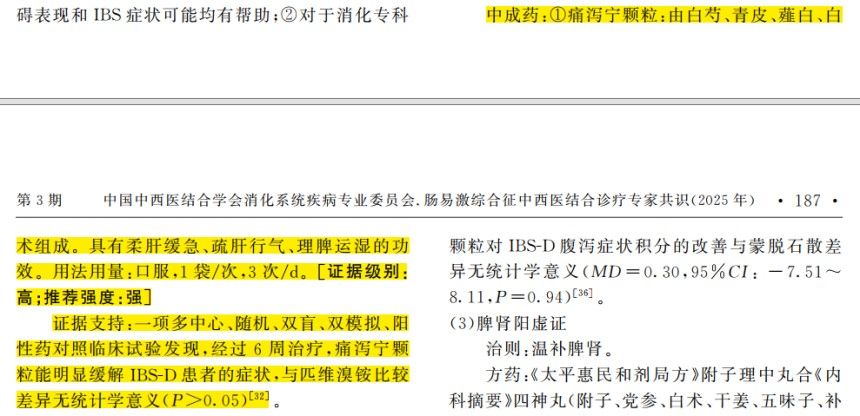 痛瀉寧顆粒是目前治療 IBS-D 循證最多、質(zhì)量最高的中成藥,因其療效確切、安全性高、經(jīng)濟(jì)性好等優(yōu)勢顯著,先后獲10余項國際國內(nèi)指南/共識推薦,且是中華醫(yī)學(xué)會《2020年中國腸易激綜合征專家共識意見》唯一推薦及《腸易激綜合征中西醫(yī)結(jié)合診療專家共識(2025年)》唯一高證據(jù)質(zhì)量、強(qiáng)推薦的中成藥。