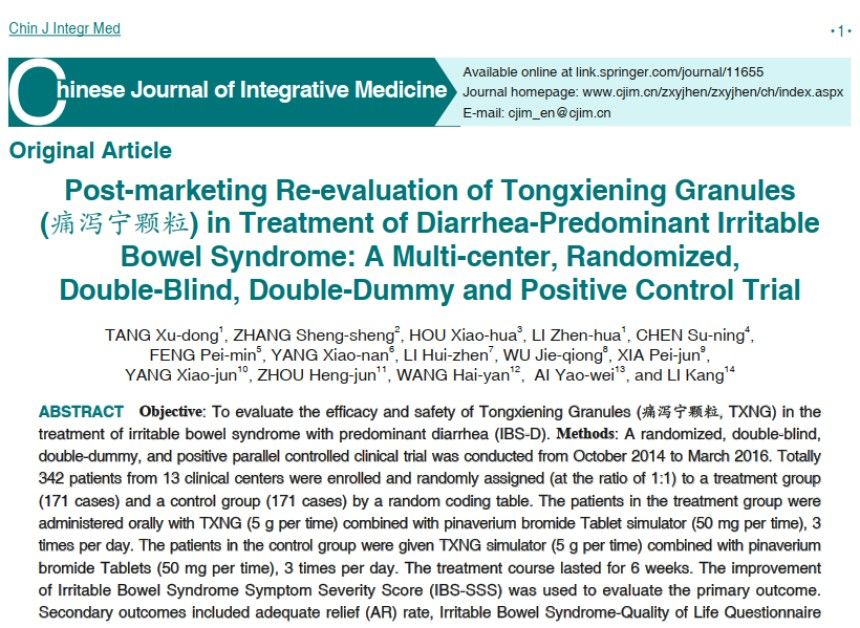 痛瀉寧顆粒已在臨床應(yīng)用10余年,積累了大量的臨床研究數(shù)據(jù)與應(yīng)用經(jīng)驗。20余項高質(zhì)量隨機(jī)對照(RCT)臨床研究顯示:痛瀉寧顆粒能多環(huán)節(jié)、多靶點有效改善IBS-D患者腹痛、腹瀉、腹脹、腹部不適等整體癥狀,且可明顯延長復(fù)發(fā)或加重的時間,有效降低復(fù)發(fā)率。一項痛瀉寧顆粒治療IBS-D與得舒特(匹維溴銨片)進(jìn)行的342例的多中心、大樣本RCT臨床研究證明,痛瀉寧顆粒治療IBS-D整體療效與得舒特(匹維溴銨片,臨床一線陽性化藥)相當(dāng)或更優(yōu),痛瀉寧顆粒起效更快,對重癥IBS-D和女性患者療效更好,復(fù)發(fā)率更低;該研究成果已在國際權(quán)威期刊《Chinese Journal of Integrative Medicine》(IF 2.9)發(fā)表。另一項納入480例患者的多中心RCT臨床研究也顯示,痛瀉寧顆粒治療IBS-D安全、有效,療效顯著優(yōu)于安慰劑組,且用藥期間無明顯不良反應(yīng)。