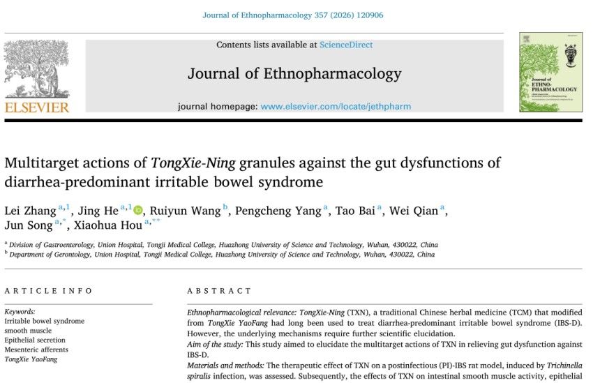 近期,國際權(quán)威期刊《Journal of Ethnopharmacology 》(IF 4.8)發(fā)布的關(guān)于痛瀉寧顆粒最新重磅研究成果,從現(xiàn)代科學(xué)的角度闡明了痛瀉寧顆粒有效治療腹瀉型腸易激綜合征(IBS-D)的多靶點作用機(jī)制,為其臨床應(yīng)用進(jìn)一步提供了強(qiáng)有力的科學(xué)依據(jù)。研究結(jié)果進(jìn)一步證實了痛瀉寧顆粒通過對腸道動力、分泌和感覺的多靶點作用,有效針對IBS-D的復(fù)雜病理生理機(jī)制,從而顯著改善IBS-D 腹瀉、腹痛等腸道功能障礙癥狀。
