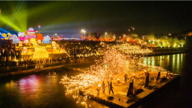 絢爛的燈組間,豐富多彩的演出與互動(dòng)活動(dòng)同樣讓游客不虛此行。每晚準(zhǔn)時(shí)上演的“激光破曉·華燈啟元”燈光秀,以光影為筆,夜空為幕,在聲光交織間開(kāi)啟一場(chǎng)流光溢彩、萬(wàn)象啟元的沉浸盛典。無(wú)人機(jī)天幕秀以深邃夜空為畫(huà)布、璀璨燈光為畫(huà)筆,震撼演繹“愛(ài)你老己”“飛馬騰空”“鯉躍龍門(mén)”“賽博仙子”“醒獅賀歲”等特色光影圖案,配合激昂背景音樂(lè),打造出一場(chǎng)無(wú)與倫比的視聽(tīng)盛宴;非遺打鐵花在湖面驚艷亮相,鐵花飛濺如金蛇狂舞、星火漫天,非遺古韻與新春氛圍完美交融,讓游客感受傳統(tǒng)民俗的極致魅力。麒麟彩車(chē)、鰲魚(yú)彩車(chē)等主題彩車(chē)融合民俗元素與新潮設(shè)計(jì),巡游隊(duì)伍一路歡歌一路游樂(lè),喜慶的氛圍游動(dòng)在燈會(huì)各個(gè)角落。