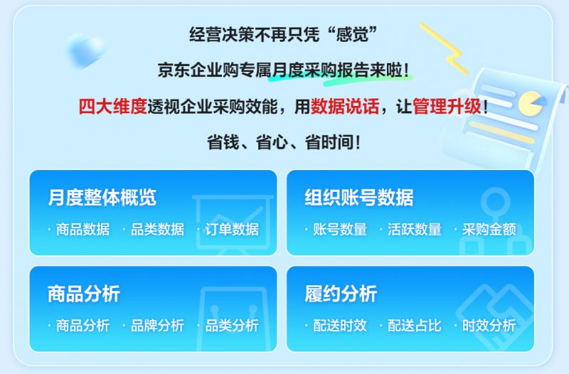 京東企業(yè)購(gòu)依托大數(shù)據(jù)與AI技術(shù),結(jié)合行業(yè)特性、預(yù)算及采購(gòu)場(chǎng)景,為中小企業(yè)智能推送適配的年貨方案;同時(shí),平臺(tái)通過(guò)采購(gòu)管理后臺(tái)實(shí)現(xiàn)清單生成、訂單實(shí)時(shí)查詢,并推出專屬月度采購(gòu)報(bào)告,從月度整體概覽、組織賬號(hào)數(shù)據(jù)、商品分析、履約分析四大維度,全面透視企業(yè)采購(gòu)全鏈路數(shù)據(jù),讓采購(gòu)決策從“憑感覺(jué)”升級(jí)為“用數(shù)據(jù)說(shuō)話”,助力企業(yè)實(shí)現(xiàn)高效、透明的采購(gòu)管理。