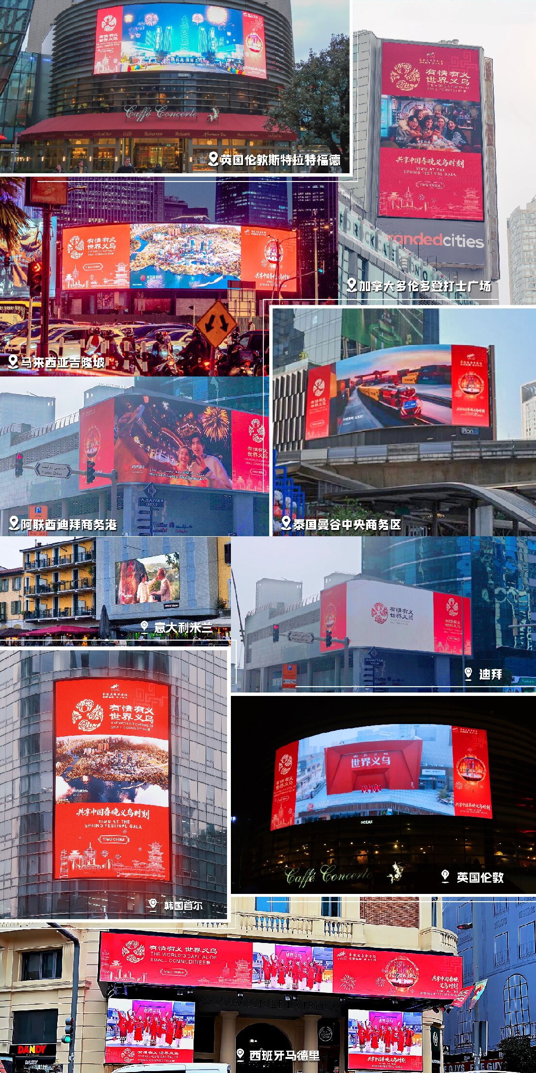 美國(guó)紐約時(shí)代廣場(chǎng)、加拿大多倫多登打士廣場(chǎng)、阿聯(lián)酋迪拜CBDBay、法國(guó)巴黎歌劇院大街、意大利米蘭納維利、英國(guó)倫敦斯特拉特福德市、韓國(guó)首爾明洞乙支路、馬來西亞吉隆坡燕美路等20個(gè)國(guó)家和地區(qū)核心商圈的戶外大屏,同步滾動(dòng)播放義烏城市形象宣傳片及央視2026年春晚義烏分會(huì)場(chǎng)邀約海報(bào)。